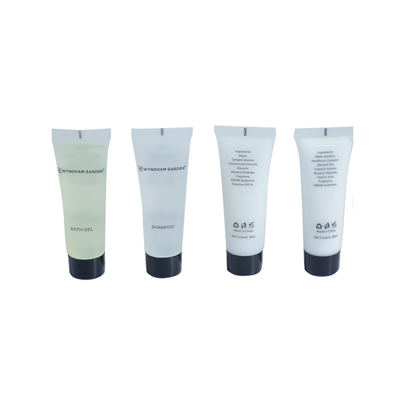 The bottle body is a transparent soft tube with a black screw cap. Bottle styles can be adjusted to black Pet bottles, cream soft tubes, or PVC bottles based on hotel preferences.