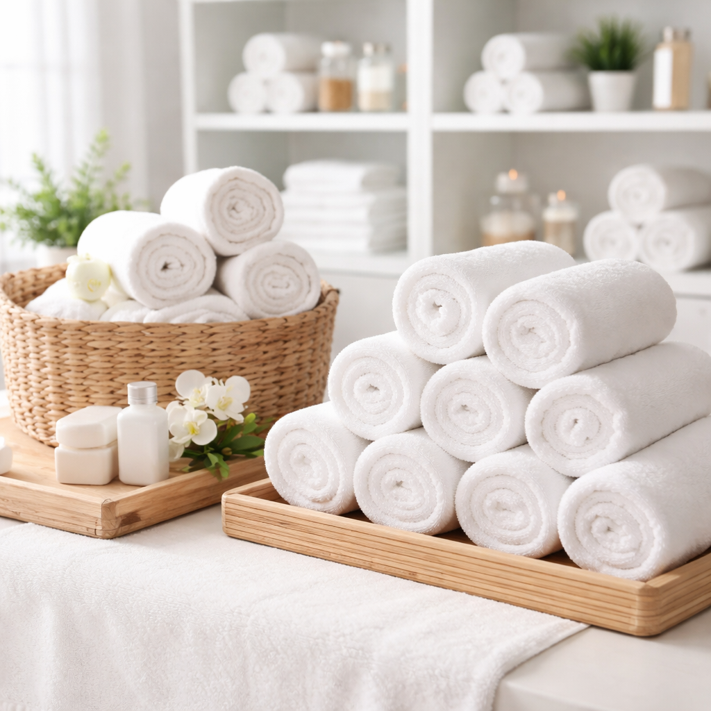 A: Rolled hotel towels help maintain organized shelves, save storage space, and create a welcoming spa atmosphere. Hotels also choose luxury hotel towels because their fabric structure keeps the roll tight and visually consistent.