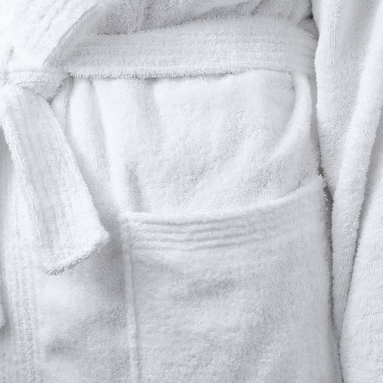 Features a shawl collar, long sleeves, and a jacquard waistband, blending timeless elegance with a tailored fit that elevates hotel bathroom aesthetics and ensures guest comfort.