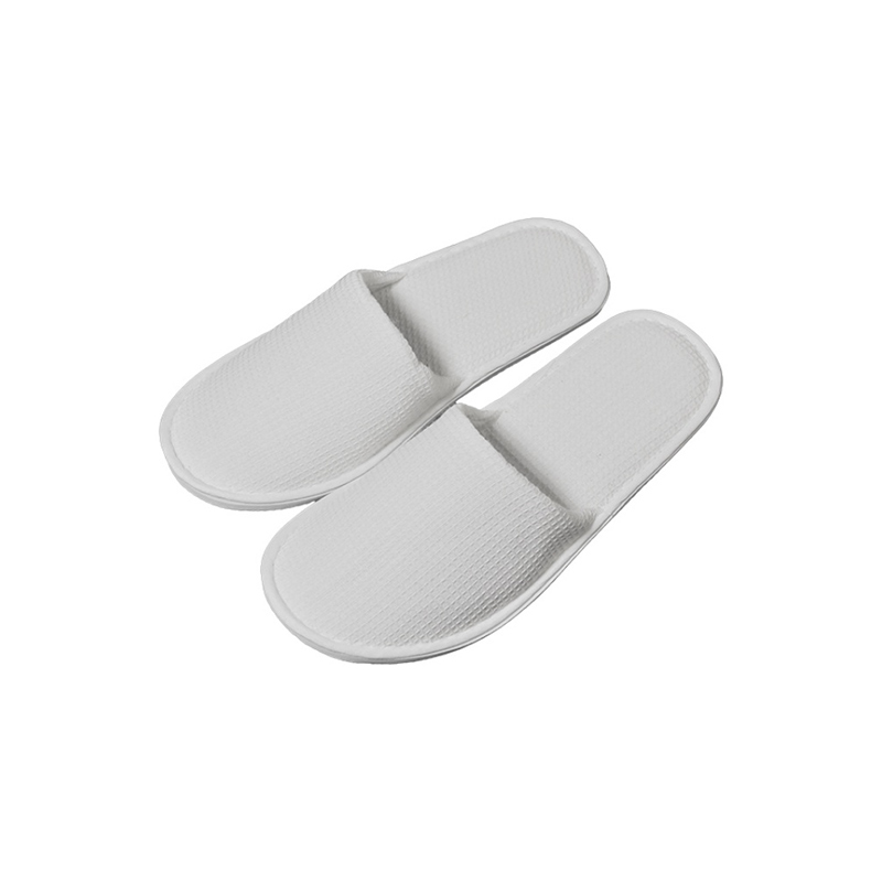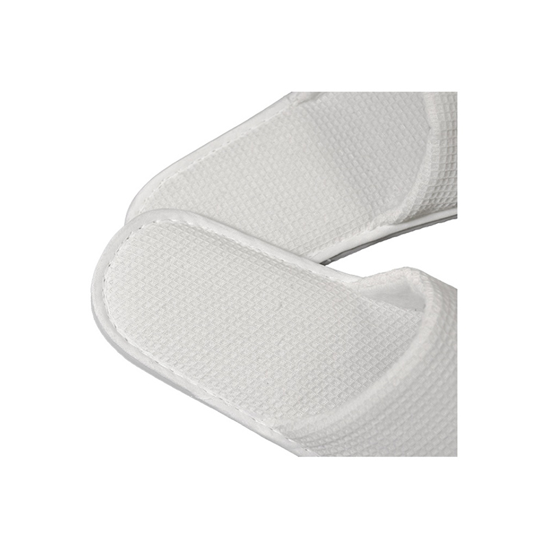 The slipper body is crafted from high-quality 300gsm waffle fabric, known for its soft texture and breathability. The sole is made of 5mm white EVA, a lightweight yet durable material that provides excellent traction. Additional material options include non-woven fabric, terry towel, and coral velvet for customized orders.
