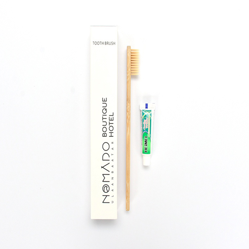 The Bamboo Dental Kit features a 19cm ergonomic bamboo handle—lightweight yet durable—paired with a soft-bristle black toothbrush that gently cleans teeth without irritating gums. It includes 5g fluoride-rich Colgate toothpaste, proven to prevent cavities and freshen breath, perfect for daily hotel use. Each dental kit is individually packaged in a hygienic opp bag and a 250gsm Kraft paper box with two-color printing, supporting custom logo hotel amenities branding.